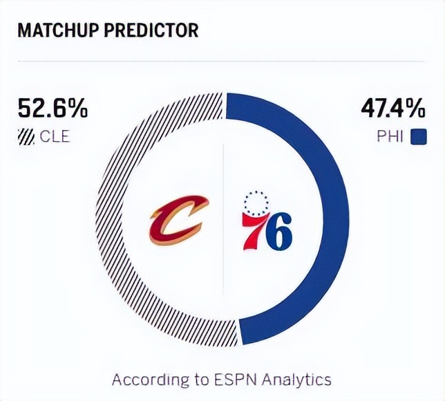 反观76人,上一场主场大比分失利,全队整体状态低迷,攻防两端均未打出应有水准。球队核心恩比德虽拿下全队最高的20分,但面对骑士双塔的针对性防守,进攻端明显感到吃力;马克西则陷入投篮低迷,16投仅5中,仅得到14分,远低于正常水准;乔治贡献17分、埃奇库姆拿下9 分,乌布雷与格莱姆斯坐镇的替补席,整体表现平平,未能为球队提供有效火力支援。76 人目前的防守水准本就难言出色,若此番交手仍无法在进攻端建立压制,想要凭借防守限制住进攻火力凶猛的骑士,难度可想而知。ESPN的赛前预测,骑士胜率为54.0%,而76人的胜率只有46.0%。