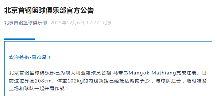 北京男篮官方公告表示:北京首钢篮球俱乐部已为澳大利亚籍球员马帝昂完成注册。目前这位身高208cm、体重102kg的内线新援已经抵达湖南长沙,与球队会合,随时准备上场和球队一起并肩作战!