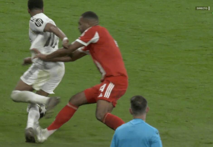 比赛第71分钟出现争议一幕:姆巴佩在进攻中完成过人后,拜仁中卫塔在防守中踩到了他的脚踝。尽管VAR介入回看,这次犯规最终只被判为黄牌。