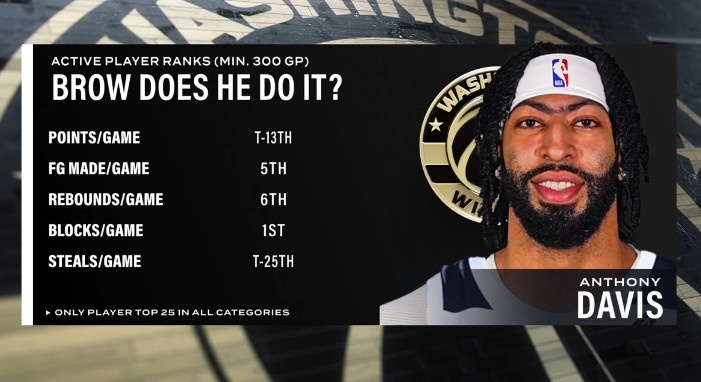 场均得分 并列现役第13场均投篮命中数 现役第5场均篮板 现役第6场均盖帽 现役第1场均抢断 并列现役第25同时也是唯一一位上述数据均进入现役前25的球员...
